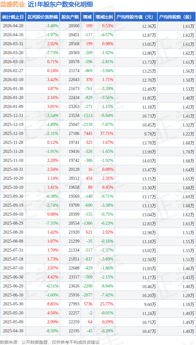 从股价来看,2026年4月10日至2026年4月20日,益盛药业区间跌幅为3.4%,在此期间股东户数增加109.0户,增幅为0.53%。