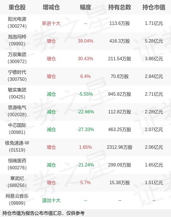 证券之星消息,4月22日东方红资产管理旗下胡晓 李竞管理的东方红启恒三年持有期混合型基金公布一季报,近1年净值增长率18.77%。与上一季度相比,该基金前十大重仓股新增阳光电源;并对泡泡玛特增仓116.88万股,为该基金第一大重仓股;网易云音乐等退出前十大重仓股;详细数据如下:以上内容为证券之星据公开信息整理,由AI算法生成(网信算备310104345710301240019号),不构成投资建议。
