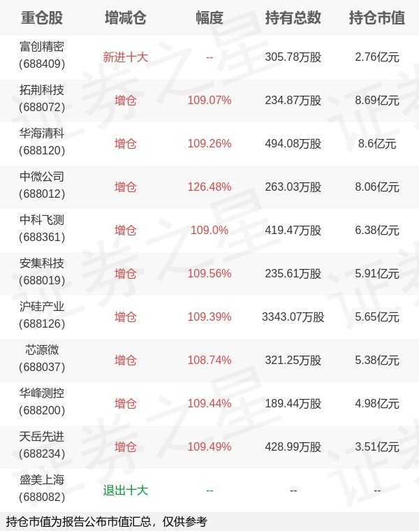 证券之星消息,4月22日华夏基金旗下杨斯琪管理的华夏上证科创板半导体材料设备主题交易型开放式指数基金公布一季报,近1年净值增长率75.59%。与上一季度相比,该基金前十大重仓股新增富创精密;并对拓荆科技增仓122.53万股,为该基金第一大重仓股;盛美上海等退出前十大重仓股;详细数据如下:以上内容为证券之星据公开信息整理,由AI算法生成(网信算备310104345710301240019号),不构成投资建议。相关 ETF