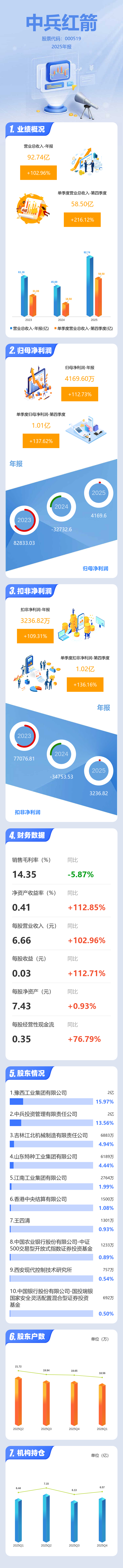 证券之星消息,中兵红箭2025年年报显示,当年度公司主营收入92.74亿元,同比上升102.97%;归母净利润4169.6万元,同比上升112.74%;扣非净利润3236.82万元,同比上升109.31%;其中2025年第四季度,公司单季度主营收入58.5亿元,同比上升216.13%;单季度归母净利润1.01亿元,同比上升137.63%;单季度扣非净利润1.02亿元,同比上升136.16%;负债率45.51%,财务费用-7673.53万元,毛利率14.35%。