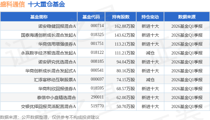 持有盛科通信最多的基金为诺安稳健回报混合A,目前规模为10.17亿元,最新净值2.467(4月23日),较上一交易日下跌2.68%,近一年上涨83.69%。该基金现任基金经理为邓心怡。