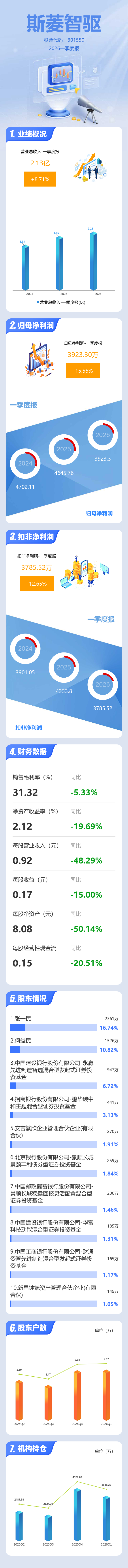 证券之星消息,斯菱智驱2026年一季报显示,一季度公司主营收入2.13亿元,同比上升8.72%;归母净利润3923.3万元,同比下降15.55%;扣非净利润3785.52万元,同比下降12.65%;负债率26.38%,投资收益678.93万元,财务费用810.93万元,毛利率31.32%。