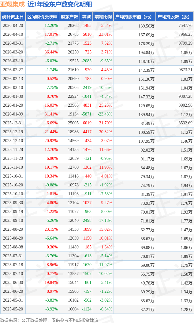 证券之星消息,近日亚翔集成披露,截至2026年4月20日公司股东户数为2.83万户,较4月10日增加1485.0户,增幅为5.54%。户均持股数量由上期的7966.0股减少至7548.0股,户均持股市值为139.5万元。