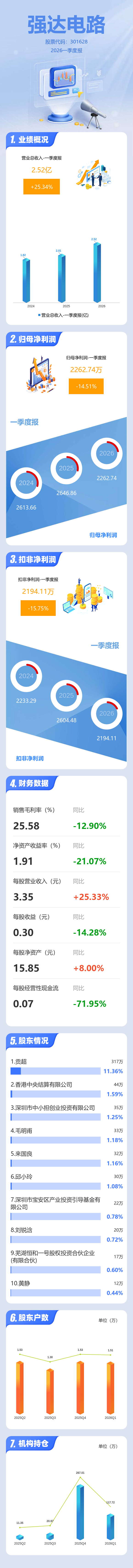 证券之星消息,强达电路2026年一季报显示,一季度公司主营收入2.52亿元,同比上升25.34%;归母净利润2262.74万元,同比下降14.51%;扣非净利润2194.11万元,同比下降15.76%;负债率27.02%,投资收益26.95万元,财务费用139.87万元,毛利率25.58%。