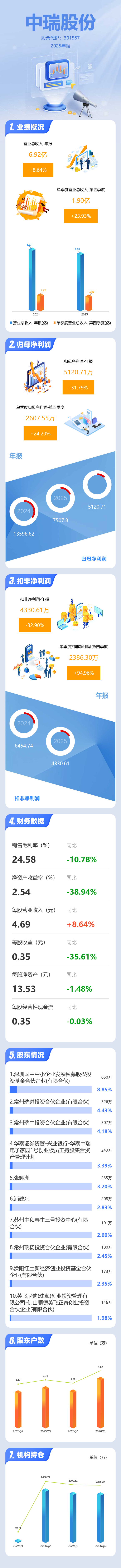 证券之星消息,中瑞股份2025年年报显示,当年度公司主营收入6.92亿元,同比上升8.65%;归母净利润5120.71万元,同比下降31.79%;扣非净利润4330.61万元,同比下降32.91%;其中2025年第四季度,公司单季度主营收入1.9亿元,同比上升23.94%;单季度归母净利润2607.55万元,同比上升24.2%;单季度扣非净利润2386.3万元,同比上升94.97%;负债率14.68%,投资收益620.02万元,财务费用-770.45万元,毛利率24.58%。
