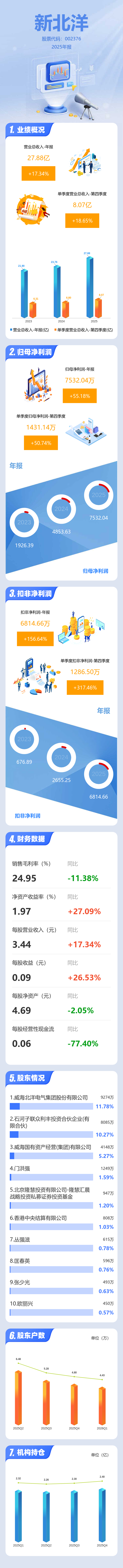 证券之星消息,新北洋2025年年报显示,当年度公司主营收入27.88亿元,同比上升17.34%;归母净利润7532.04万元,同比上升55.18%;扣非净利润6814.66万元,同比上升156.65%;其中2025年第四季度,公司单季度主营收入8.07亿元,同比上升18.65%;单季度归母净利润1431.14万元,同比上升50.75%;单季度扣非净利润1286.5万元,同比上升317.46%;负债率31.28%,投资收益1.41亿元,财务费用-389.5万元,毛利率24.95%。