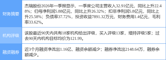 2026年4月19日,东吴证券研究员周尔双,黄瑞发布了对杰瑞股份的研报《2025年报&2026一季报点评:Q1业绩超预期,天然气&燃气轮机均开始兑现业绩》,该研报对杰瑞股份给出“买入”评级。证券之星数据中心根据近三年发布的研报数据计算,该研报作者对此股的盈利预测准确度为87.84%。