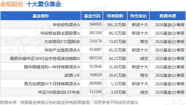 根据2026基金Q1季报公募基金重仓股数据,重仓该股的公募基金共9家,其中持有数量最多的公募基金为华安基金的华安宏利混合A。华安宏利混合A目前规模为16.62亿元,最新净值6.2777(4月22日),较上一交易日上涨0.38%,近一年上涨30.08%。该公募基金现任基金经理为王春。王春在任的基金产品包括:华安新丝路主题股票A,管理时间为2022年3月28日至今,期间收益率为-18.85%;华安产业趋势混合A,管理时间为2022年8月3日至今,期间收益率为-19.17%。