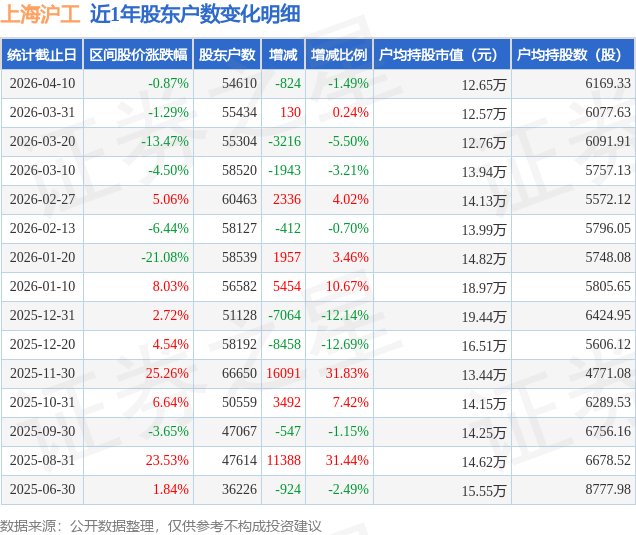 从股价来看,2026年3月31日至2026年4月10日,上海沪工区间跌幅为0.87%,在此期间股东户数减少824.0户,减幅为1.49%。