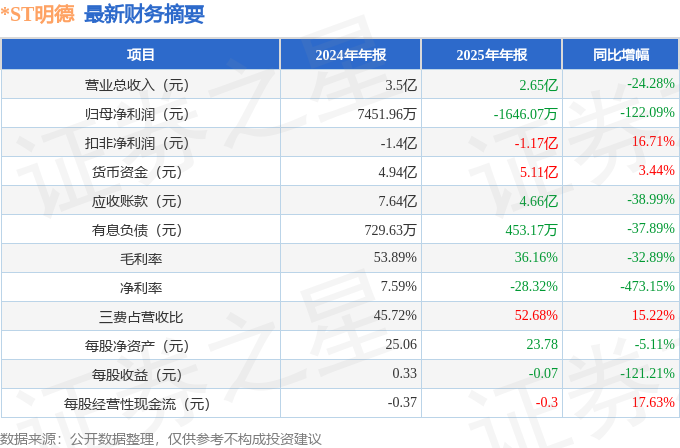 据证券之星公开数据整理,近期*ST明德(002932)发布2025年年报。截至本报告期末,公司营业总收入2.65亿元,同比下降24.28%,归母净利润-1646.07万元,同比下降122.09%。按单季度数据看,第四季度营业总收入3827.05万元,同比下降69.25%,第四季度归母净利润-2997.62万元,同比下降367.01%。本报告期*ST明德公司应收账款体量较大,当期应收账款占最新年报营业总收入比达175.95%。