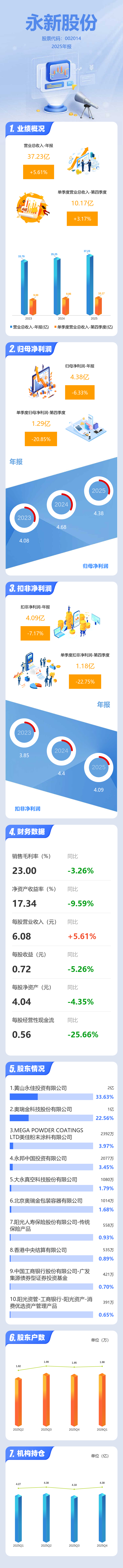 证券之星消息,永新股份2025年年报显示,当年度公司主营收入37.23亿元,同比上升5.61%;归母净利润4.38亿元,同比下降6.33%;扣非净利润4.09亿元,同比下降7.17%;其中2025年第四季度,公司单季度主营收入10.17亿元,同比上升3.17%;单季度归母净利润1.29亿元,同比下降20.85%;单季度扣非净利润1.18亿元,同比下降22.75%;负债率41.68%,投资收益1722.77万元,财务费用2759.51万元,毛利率23.0%。