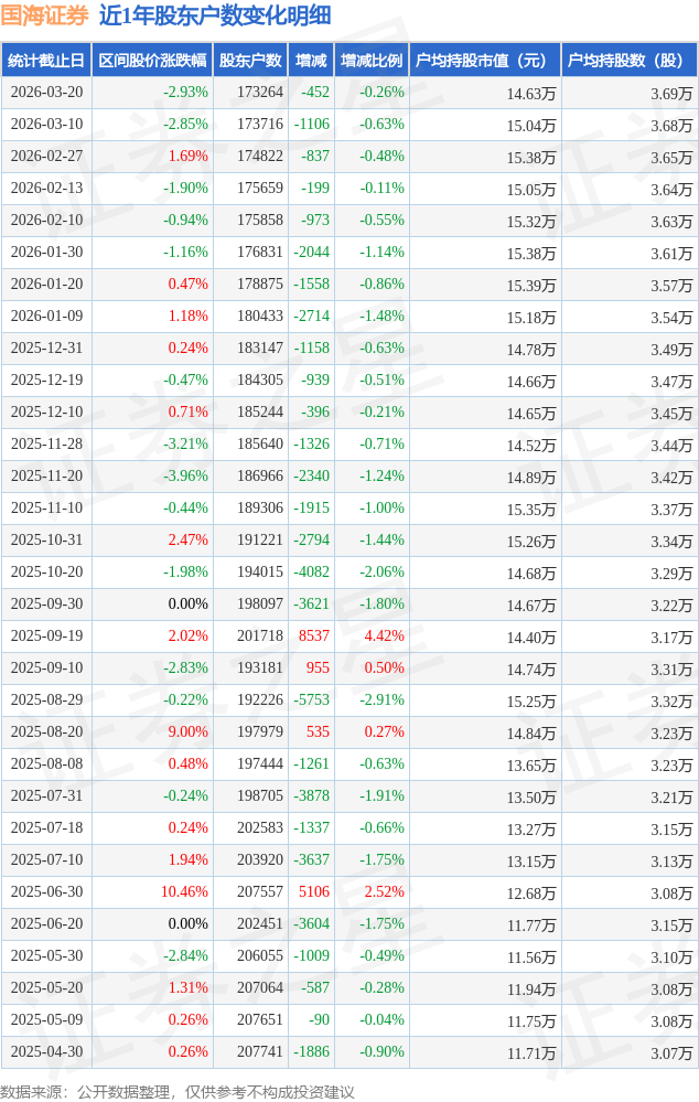 从股价来看,2026年3月10日至2026年3月20日,国海证券区间跌幅为2.93%,在此期间股东户数减少452.0户,减幅为0.26%。