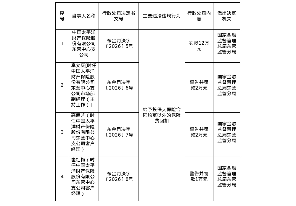 此外,中国太平洋财产保险股份有限公司东营中心支公司因给予投保人保险合同约定以外的保险费回扣,被罚款12万元。市场部副经理李文庆、客户经理高爱芳分别被警告并处罚款2万元;客户经理崔红梅被警告并处罚款1万元。