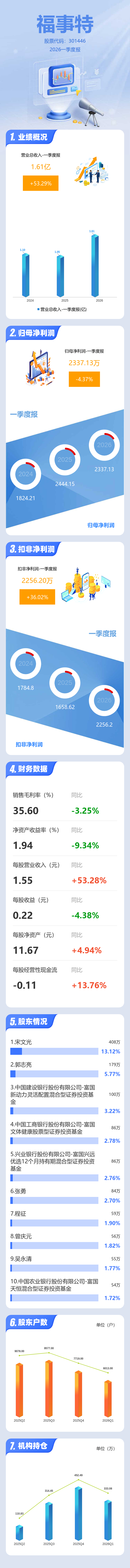 证券之星消息,福事特2026年一季报显示,一季度公司主营收入1.61亿元,同比上升53.29%;归母净利润2337.13万元,同比下降4.38%;扣非净利润2256.2万元,同比上升36.03%;负债率15.77%,投资收益74.51万元,财务费用23.5万元,毛利率35.6%。