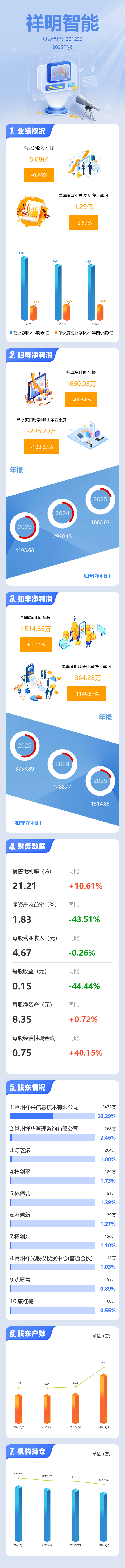 证券之星消息,祥明智能2025年年报显示,当年度公司主营收入5.08亿元,同比下降0.27%;归母净利润1660.03万元,同比下降43.35%;扣非净利润1514.85万元,同比上升1.77%;其中2025年第四季度,公司单季度主营收入1.29亿元,同比下降2.57%;单季度归母净利润-298.2万元,同比下降133.27%;单季度扣非净利润-364.28万元,同比下降1146.57%;负债率13.09%,投资收益333.75万元,财务费用-794.16万元,毛利率21.21%。