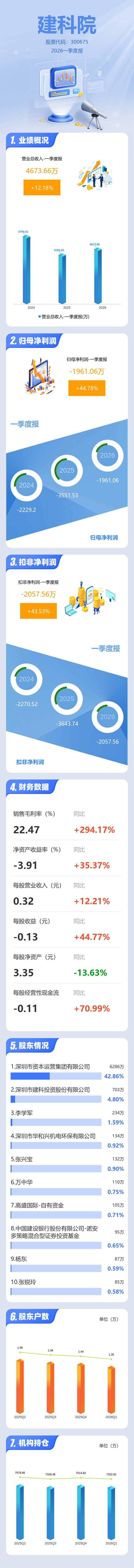 证券之星消息,建科院2026年一季报显示,一季度公司主营收入4673.66万元,同比上升12.19%;归母净利润-1961.06万元,同比上升44.78%;扣非净利润-2057.56万元,同比上升43.53%;负债率60.58%,投资收益0.0万元,财务费用385.85万元,毛利率22.47%。