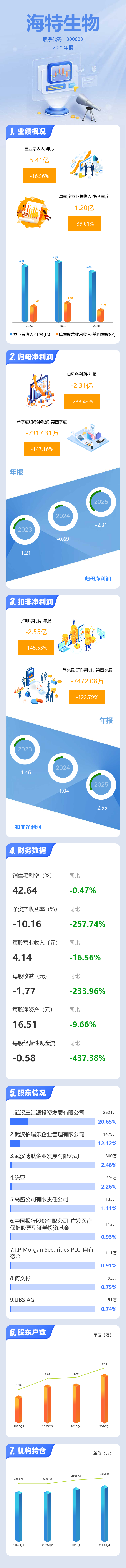 证券之星消息,海特生物2025年年报显示,当年度公司主营收入5.41亿元,同比下降16.57%;归母净利润-2.31亿元,同比下降233.48%;扣非净利润-2.55亿元,同比下降145.54%;其中2025年第四季度,公司单季度主营收入1.2亿元,同比下降39.62%;单季度归母净利润-7317.31万元,同比下降147.16%;单季度扣非净利润-7472.08万元,同比下降122.8%;负债率15.8%,投资收益2064.35万元,财务费用-472.24万元,毛利率42.64%。