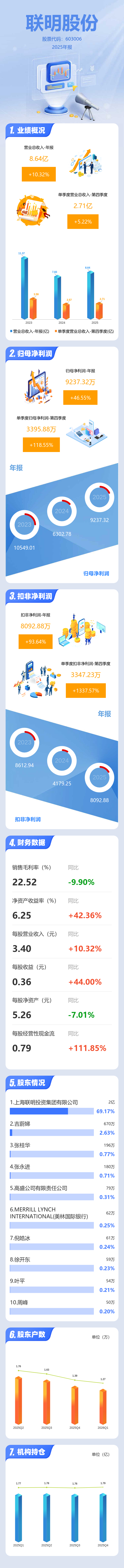 证券之星消息,联明股份2025年年报显示,当年度公司主营收入8.64亿元,同比上升10.32%;归母净利润9237.32万元,同比上升46.56%;扣非净利润8092.88万元,同比上升93.64%;其中2025年第四季度,公司单季度主营收入2.71亿元,同比上升5.22%;单季度归母净利润3395.88万元,同比上升118.56%;单季度扣非净利润3347.23万元,同比上升1337.58%;负债率25.71%,投资收益1236.86万元,财务费用-247.31万元,毛利率22.52%。