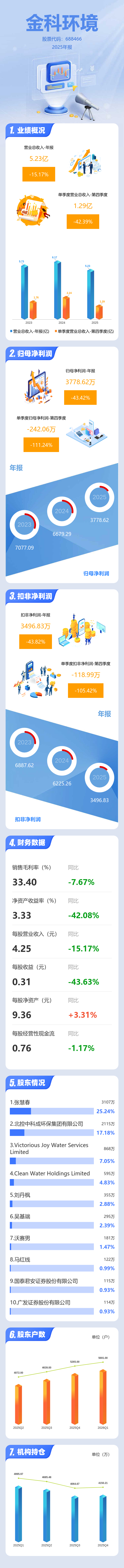 证券之星消息,金科环境2025年年报显示,当年度公司主营收入5.23亿元,同比下降15.18%;归母净利润3778.62万元,同比下降43.43%;扣非净利润3496.83万元,同比下降43.83%;其中2025年第四季度,公司单季度主营收入1.29亿元,同比下降42.39%;单季度归母净利润-242.06万元,同比下降111.24%;单季度扣非净利润-118.99万元,同比下降105.42%;负债率47.04%,投资收益246.25万元,财务费用1704.82万元,毛利率33.4%。