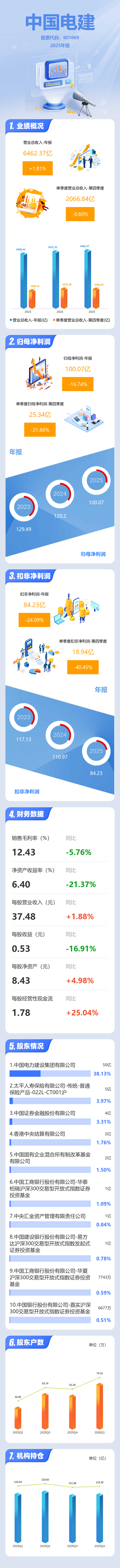 证券之星消息,中国电建2025年年报显示,当年度公司主营收入6462.37亿元,同比上升1.81%;归母净利润100.07亿元,同比下降16.75%;扣非净利润84.23亿元,同比下降24.1%;其中2025年第四季度,公司单季度主营收入2066.84亿元,同比下降0.6%;单季度归母净利润25.34亿元,同比下降21.86%;单季度扣非净利润18.94亿元,同比下降40.45%;负债率79.59%,投资收益18.45亿元,财务费用117.96亿元,毛利率12.43%。