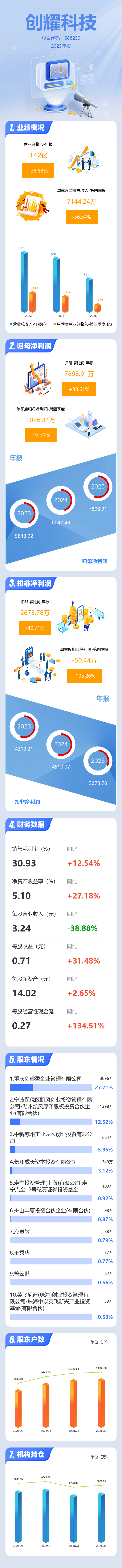 证券之星消息,创耀科技2025年年报显示,当年度公司主营收入3.62亿元,同比下降38.89%;归母净利润7898.91万元,同比上升30.61%;扣非净利润2673.78万元,同比下降40.72%;其中2025年第四季度,公司单季度主营收入7144.24万元,同比下降56.55%;单季度归母净利润1026.34万元,同比下降24.47%;单季度扣非净利润-50.44万元,同比下降105.27%;负债率11.67%,投资收益324.5万元,财务费用-2763.32万元,毛利率30.93%。