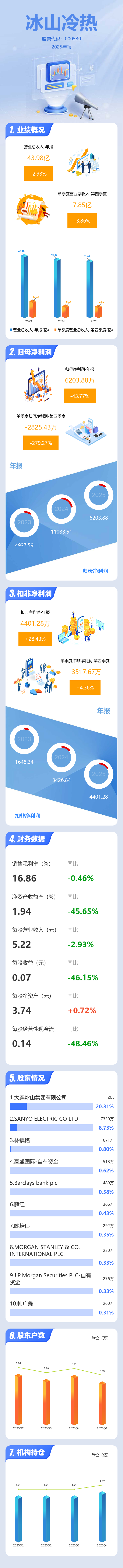 证券之星消息,冰山冷热2025年年报显示,当年度公司主营收入43.98亿元,同比下降2.94%;归母净利润6203.88万元,同比下降43.77%;扣非净利润4401.28万元,同比上升28.44%;其中2025年第四季度,公司单季度主营收入7.85亿元,同比下降3.86%;单季度归母净利润-2825.43万元,同比下降279.27%;单季度扣非净利润-3517.67万元,同比上升4.37%;负债率57.76%,投资收益3062.48万元,财务费用1796.61万元,毛利率16.86%。