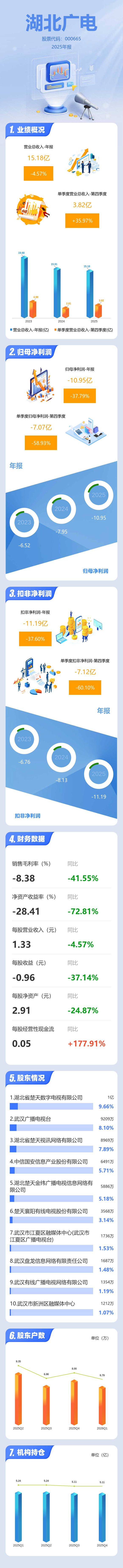 证券之星消息,湖北广电2025年年报显示,当年度公司主营收入15.18亿元,同比下降4.58%;归母净利润-10.95亿元,同比下降37.79%;扣非净利润-11.19亿元,同比下降37.6%;其中2025年第四季度,公司单季度主营收入3.82亿元,同比上升35.98%;单季度归母净利润-7.07亿元,同比下降58.94%;单季度扣非净利润-7.12亿元,同比下降60.1%;负债率65.12%,投资收益-586.98万元,财务费用1.13亿元,毛利率-8.38%。