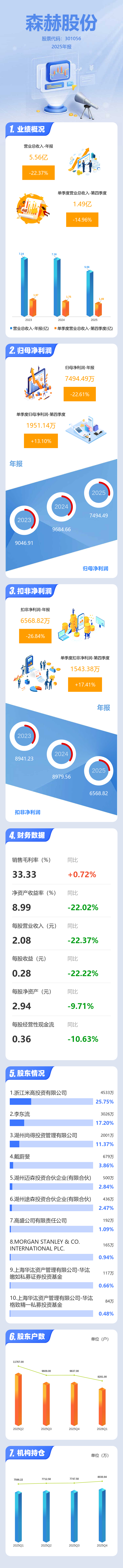 证券之星消息,森赫股份2025年年报显示,当年度公司主营收入5.56亿元,同比下降22.38%;归母净利润7494.49万元,同比下降22.61%;扣非净利润6568.82万元,同比下降26.85%;其中2025年第四季度,公司单季度主营收入1.49亿元,同比下降14.96%;单季度归母净利润1951.14万元,同比上升13.1%;单季度扣非净利润1543.38万元,同比上升17.41%;负债率37.98%,投资收益445.06万元,财务费用-1467.62万元,毛利率33.33%。