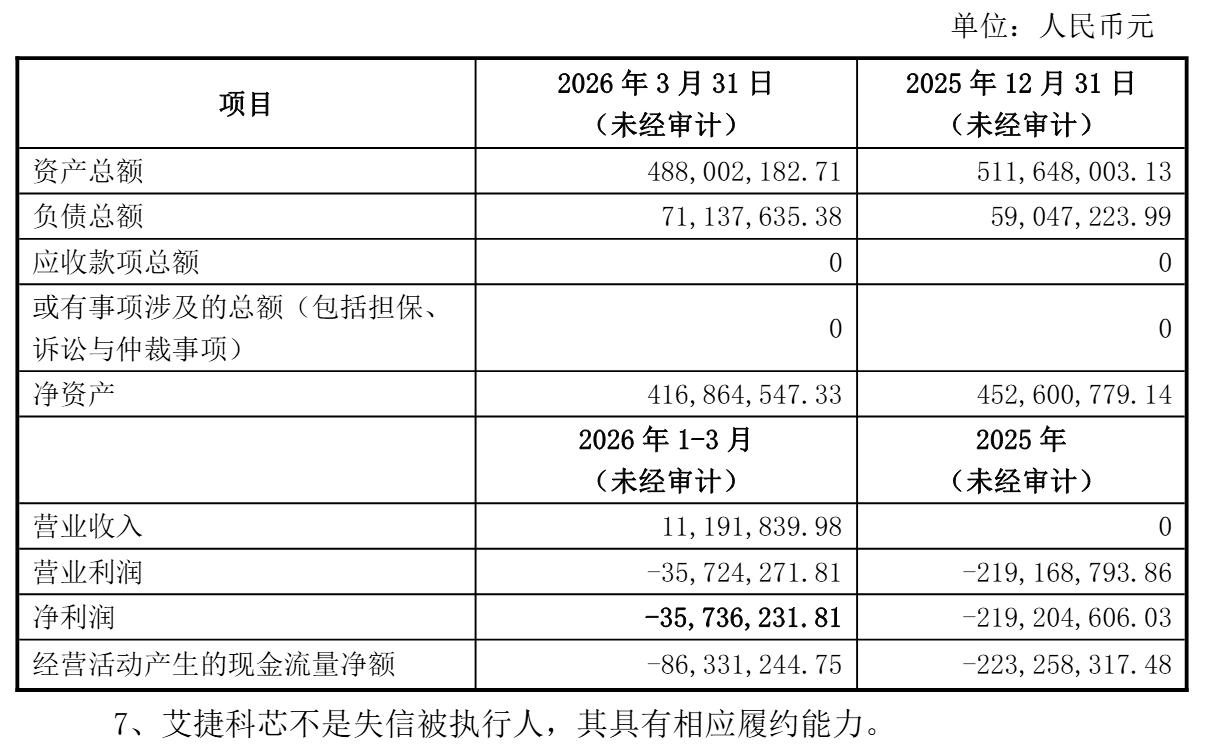 公告显示,艾捷科芯2025年无收入,净亏损2.19亿元;2026年第一季度营收为1119万元,净亏损为3574万元。