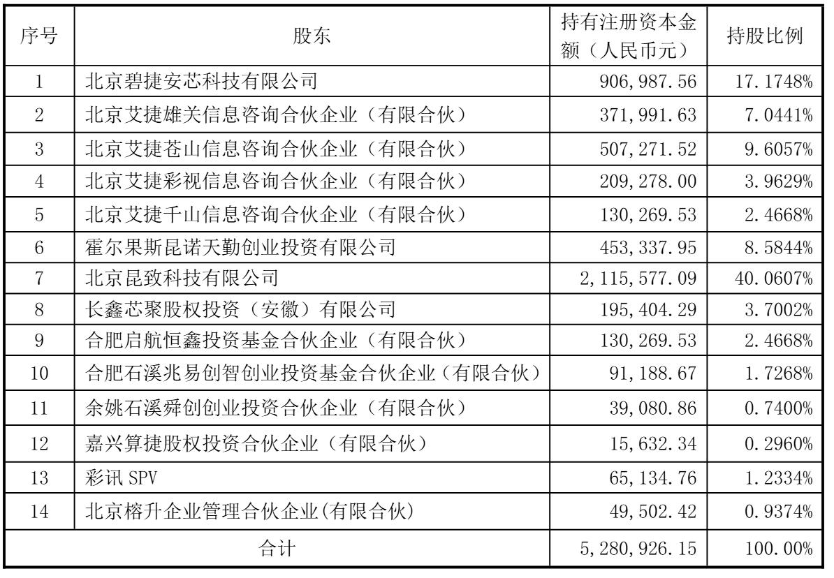 北京艾捷千山信息咨询合伙企业(有限合伙)持股为2.4668%,霍尔果斯昆诺天勤创业投资有限公司持股为8.5844%,北京昆致科技有限公司持股为40.0607%,长鑫芯聚股权投资(安徽)有限公司持股为3.7002%,合肥启航恒鑫投资基金合伙企业(有限合伙)持股为2.4668%,合肥石溪兆易创智创业投资基金合伙企业(有限合伙)持股为1.7268%,余姚石溪舜创创业投资合伙企业(有限合伙)持股为0.74%;