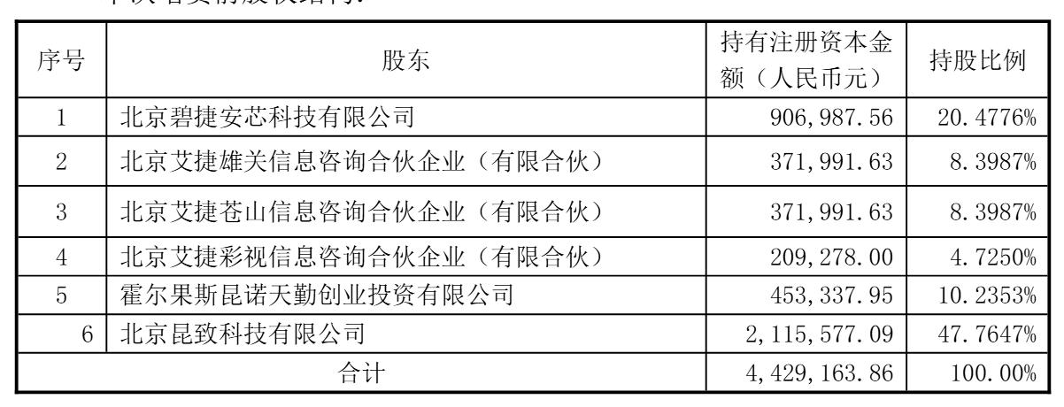 此次交易前,北京碧捷安芯科技有限公司持股为20.4776%,北京艾捷雄关信息咨询合伙企业(有限合伙)、北京艾捷苍山信息咨询合伙企业(有限合伙)分别持股为8.3987%,北京艾捷苍山信息咨询合伙企业(有限合伙)持股为4.7250%,霍尔果斯昆诺天勤创业投资有限公司持股为10.2353%,北京昆致科技有限公司持股为47.7647%。