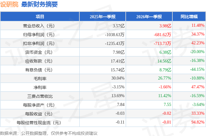 据证券之星公开数据整理,近期设研院(300732)发布2026年一季报。截至本报告期末,公司营业总收入3.98亿元,同比上升11.48%,归母净利润-681.62万元,同比上升34.37%。按单季度数据看,第一季度营业总收入3.98亿元,同比上升11.48%,第一季度归母净利润-681.62万元,同比上升34.37%。本报告期设研院公司应收账款体量较大,当期应收账款占最新年报营业总收入比达86.24%。