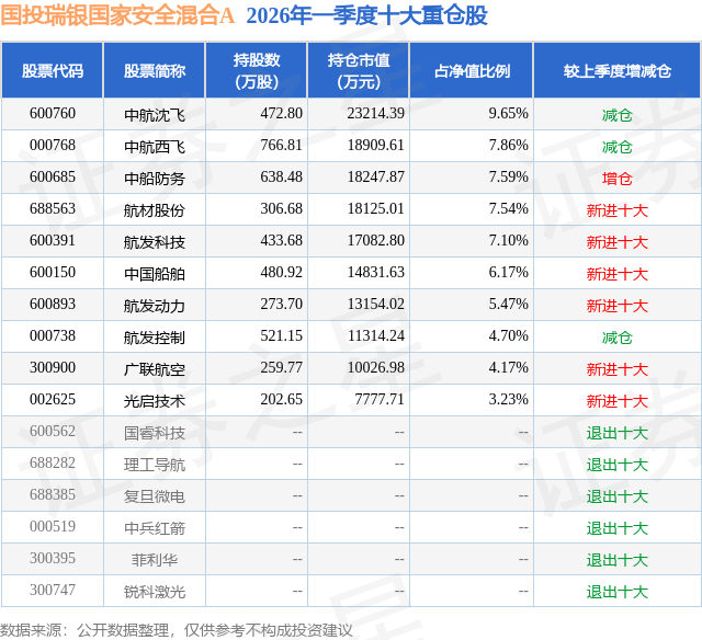 国投瑞银国家安全混合A的前十大重仓股如下: