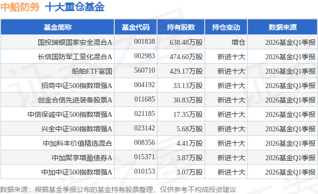 根据2026基金Q1季报公募基金重仓股数据,重仓该股的公募基金共10家,其中持有数量最多的公募基金为国投瑞银基金的国投瑞银国家安全混合A。国投瑞银国家安全混合A目前规模为19.53亿元,最新净值1.3504(4月22日),较上一交易日下跌0.26%,近一年上涨34.91%。该公募基金现任基金经理为李轩。
