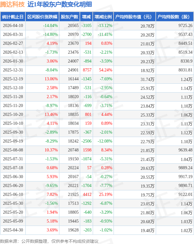 从股价来看,2026年2月27日至2026年4月10日,腾达科技区间跌幅为14.04%,在此期间股东户数减少3105.0户,减幅为13.12%。