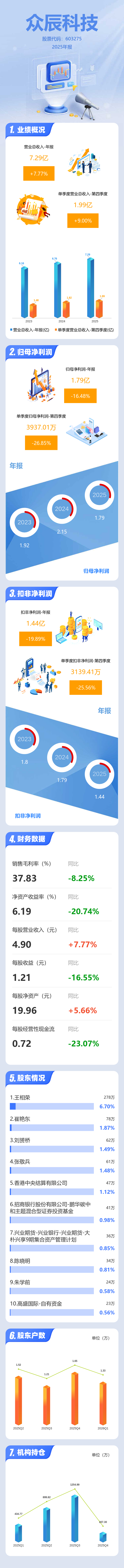 证券之星消息,众辰科技2025年年报显示,当年度公司主营收入7.29亿元,同比上升7.77%;归母净利润1.79亿元,同比下降16.48%;扣非净利润1.44亿元,同比下降19.9%;其中2025年第四季度,公司单季度主营收入1.99亿元,同比上升9.0%;单季度归母净利润3937.01万元,同比下降26.86%;单季度扣非净利润3139.41万元,同比下降25.56%;负债率12.13%,投资收益478.25万元,财务费用-1392.59万元,毛利率37.83%。
