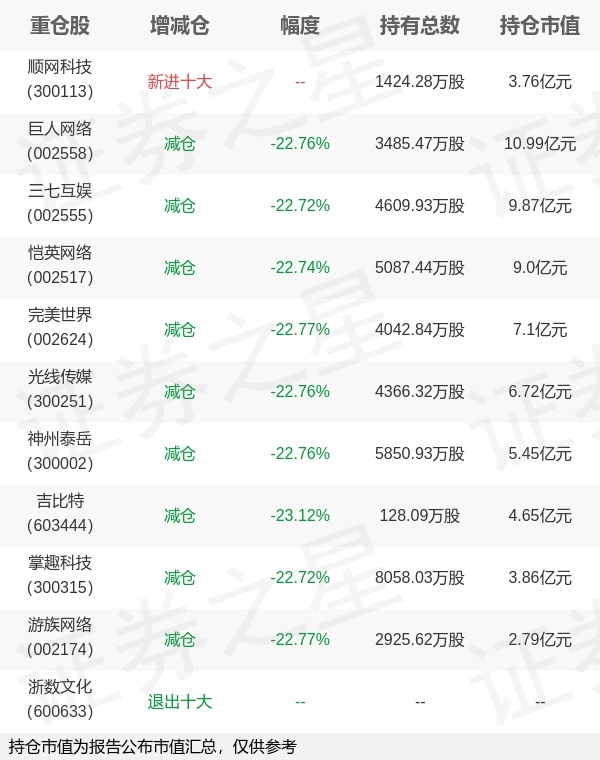 证券之星消息,4月22日华夏基金旗下鲁亚运管理的华夏中证动漫游戏交易型开放式指数基金公布一季报,近1年净值增长率21.83%。与上一季度相比,该基金前十大重仓股新增顺网科技;其中巨人网络持仓占比12.82%,为该基金第一大重仓股;浙数文化等退出前十大重仓股;详细数据如下:以上内容为证券之星据公开信息整理,由AI算法生成(网信算备310104345710301240019号),不构成投资建议。
