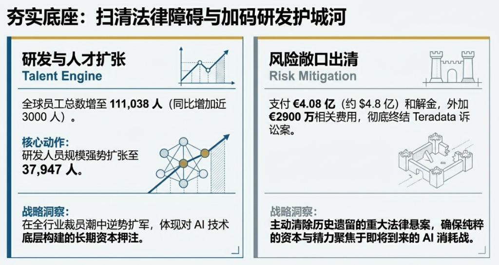 值得关注的是,一季度SAP已支付4.08亿欧元(约4.8亿美元)就Teradata诉讼达成和解,并额外计提2900万欧元费用,这一诉讼悬案的落地消除了一项潜在风险敞口。