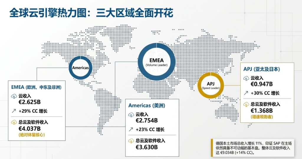 从地区维度拆解,SAP云业务在全球三大市场均录得强劲增长。