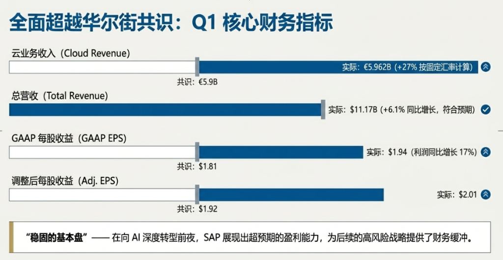 4月23日美股盘后,SAP公布2026财年第一季度财报,交出了一份优于预期的成绩单: