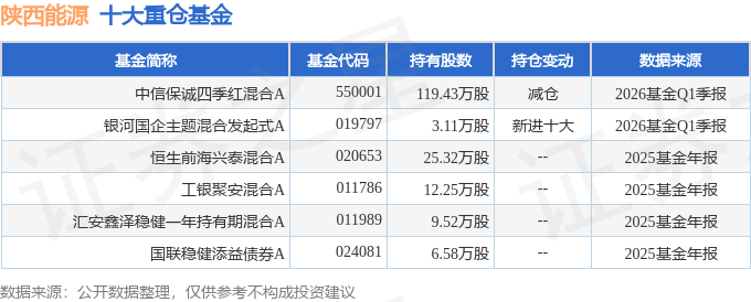 持有陕西能源最多的基金为中信保诚四季红混合A,目前规模为4.49亿元,最新净值1.0312(4月21日),较上一交易日上涨0.73%,近一年上涨19.82%。该基金现任基金经理为吴昊。