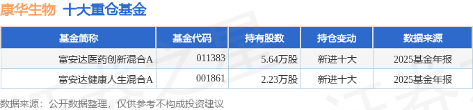 持有康华生物最多的基金为富安达医药创新混合A,目前规模为0.79亿元,最新净值0.6043(4月21日),较上一交易日下跌1.45%,近一年上涨20.71%。该基金现任基金经理为李守峰。