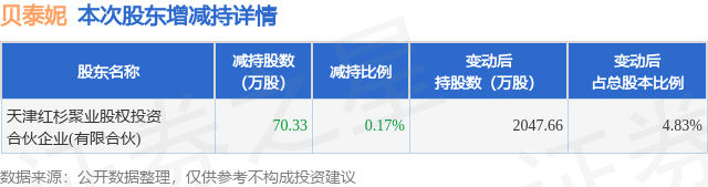 证券之星消息,4月22日贝泰妮发布公告《贝泰妮:关于持股5%以上股东减持计划实施完成的公告》,其股东天津红杉聚业股权投资合伙企业(有限合伙)于2026年4月22日合计减持70.33万股,占公司目前总股本的0.166%,变动期间该股股价下跌2.16%,截止4月22日收盘报36.21元。
