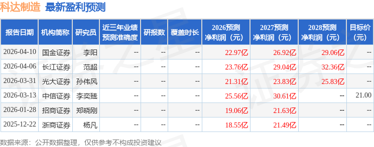 科达制造(600499) 业绩简评 2026年4月23日,公司发布2026年一季报公告:26Q1公司收入47.27亿元,同比增长25%,归母净利润5.87亿元,同比+69%,扣 非归母净利润5.7亿元,同比增长77%。在Q1汇兑明显负贡献的情况下、业绩超预期,主因海外建材、陶机、锂电负极、碳酸锂均有较优表现。 经营分析 (1)海外建材板块:预计26Q1瓷砖业务继续同环比量价齐升,同时玻璃产量继续释放。扩产方面,公司有序推进南美秘鲁玻璃、科特迪瓦陶瓷二期、肯尼亚基苏木陶瓷二期、几内亚陶瓷及加纳玻璃项目,计划于2026-2027年陆续投产。2026年4月9日公司更新重组广东特福国际进展,引入优质股东,科达与森大合作强化。(2)陶瓷机械板块:面对行业周期调整等多重挑战,业务阶段性承压,公司通过积极推进智能生产线项目落地、推动产品升级、深化海外市场拓展,以技术创新与市场深耕稳步提升业务发展质量。(3)蓝科锂业板块:受益锂价大幅上涨,碳酸锂板块(投资收益)单位盈利明显改善,26Q1碳酸锂销量0.84万吨,单季度不含税均价13.25万元/吨,单位净利6.93万元/吨。26Q1贡献归母净利2.54亿元。 (4)财务方面关注:①Q1财务费用为2.18亿元,2025年全年财务费用为2.46亿元,绝对值偏高、预计与汇损有关;②Q1管理费用为3.05亿元、25Q1为2.34亿元,预计与激励费用有关。 盈利预测、估值与评级 受益海外建材板块量价齐升、公司Q1业绩超预期,我们上调盈利预测。假设重组年内完成、特福国际全并表的情况下,我们预计公司2026-2028年归母净利润分别为33.12、39.35和42.66亿元,不考虑重组情况下,我们预计2026-2028年盈利预测分别为24.13、28.02和31.42亿元,对应PE分别为14、12、11倍,维持“买入”评级。 风险提示 海外建材新品类拓展不及预期;收购存在不确定性;汇兑损益风险;国内建材机械需求下滑;碳酸锂价格波动。