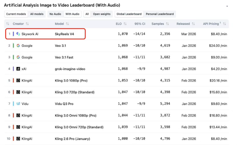 SkyReels-V4发布时在Artificial Analysis 图生视频 Image-to-Video(With Audio)中的排名表现
