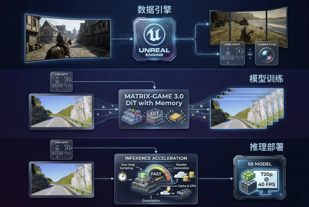 世界模型方向,Matrix-Game 2.0获得了顶级学术团队的高度认可,DiT(Diffusion Transformer)作者、纽约大学助理教授谢赛宁团队基于Matrix-Game 2.0开源底座,发布了全球首个多人视频世界模型Solaris,充分彰显了Matrix-Game 2.0在基础模型领域的技术影响力与开源生态价值;Matrix-Game 3.0实现长时序记忆、高分辨率与实时交互,模型能力与Google Genie 3齐头并进,整体技术水平跻身全球第一梯队。