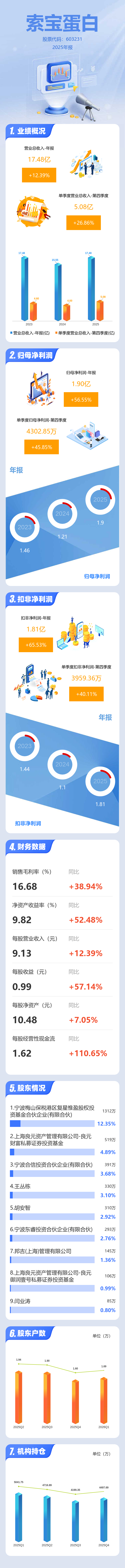 证券之星消息,索宝蛋白2025年年报显示,当年度公司主营收入17.48亿元,同比上升12.39%;归母净利润1.9亿元,同比上升56.56%;扣非净利润1.81亿元,同比上升65.54%;其中2025年第四季度,公司单季度主营收入5.08亿元,同比上升26.86%;单季度归母净利润4302.85万元,同比上升45.86%;单季度扣非净利润3959.36万元,同比上升40.11%;负债率11.57%,投资收益283.84万元,财务费用-314.21万元,毛利率16.68%。
