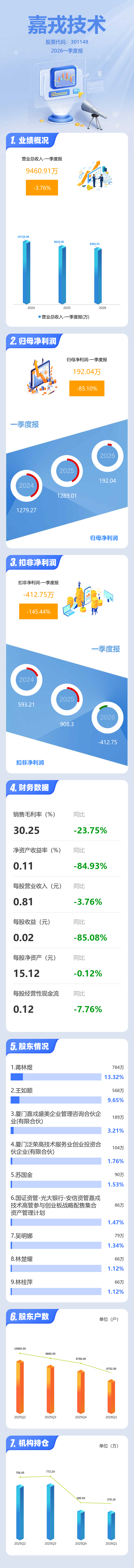 证券之星消息,嘉戎技术2026年一季报显示,一季度公司主营收入9460.91万元,同比下降3.76%;归母净利润192.04万元,同比下降85.1%;扣非净利润-412.75万元,同比下降145.44%;负债率20.54%,投资收益-3.85万元,财务费用161.07万元,毛利率30.25%。