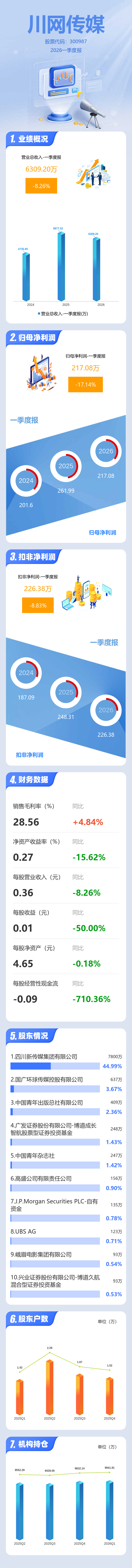 证券之星消息,川网传媒2026年一季报显示,一季度公司主营收入6309.2万元,同比下降8.26%;归母净利润217.08万元,同比下降17.14%;扣非净利润226.38万元,同比下降8.83%;负债率24.18%,投资收益4.38万元,财务费用-114.83万元,毛利率28.56%。