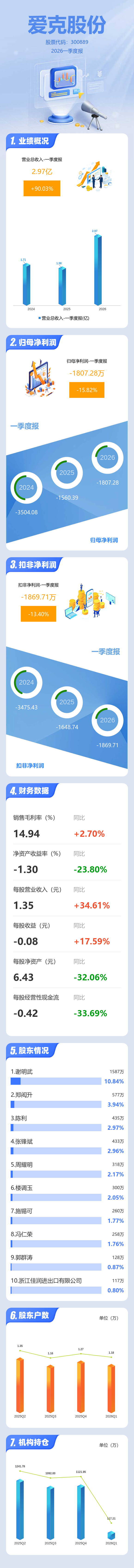 证券之星消息,爱克股份2026年一季报显示,一季度公司主营收入2.97亿元,同比上升90.03%;归母净利润-1807.28万元,同比下降15.82%;扣非净利润-1869.71万元,同比下降13.4%;负债率48.69%,投资收益-121.55万元,财务费用525.96万元,毛利率14.94%。